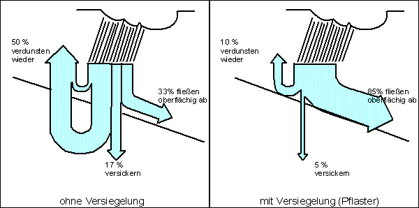 Abbildung 1:Veränderung des Wasserhaushaltes durch die Versiegelung des Bodens;